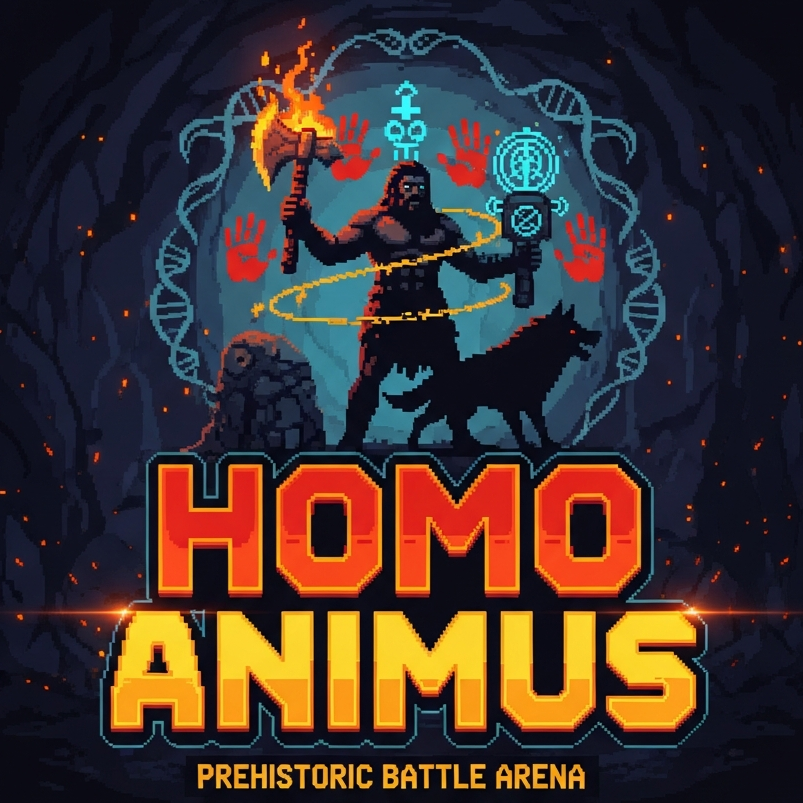 "Homo Animus" is a single-player, browser-based, prehistoric-themed card battle arena game styled as an 8-bit retro experience. Players create custom warriors by selecting from various human species (races like Homo erectus or Neanderthal), classes with unique playstyles, distributing attribute points, and equipping cards across eight categories. Battles are turn-based duels against AI opponents, resolved through a dice-rolled (d6) attack/defense calculation system with cooldowns on cards. Progression involves collecting hundreds of cards via packs, crafting, and rewards from wins, daily challenges, achievements, and character leveling. The game features deep collection management, multiple save slots via character gallery, starter deck selection, tutorials, sound/haptic feedback, and persistent local storage saves. It's entirely self-contained in one HTML file with embedded CSS and JavaScript, optimized for both desktop and mobile play with touch enhancements.