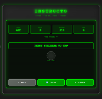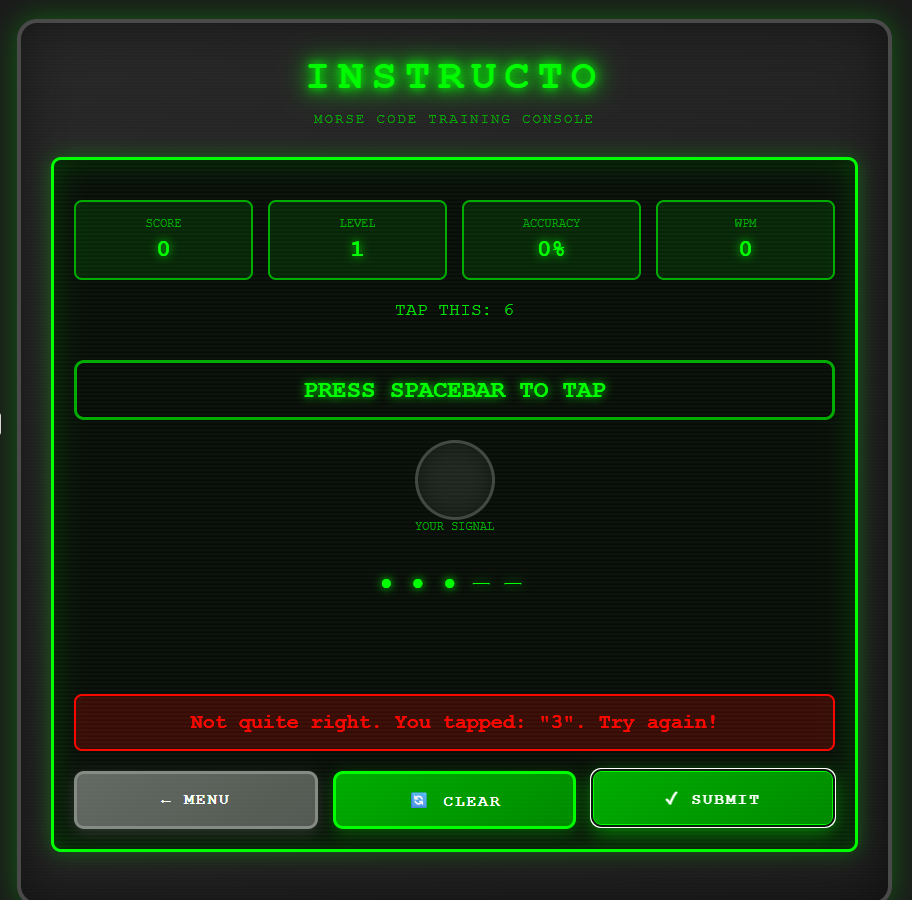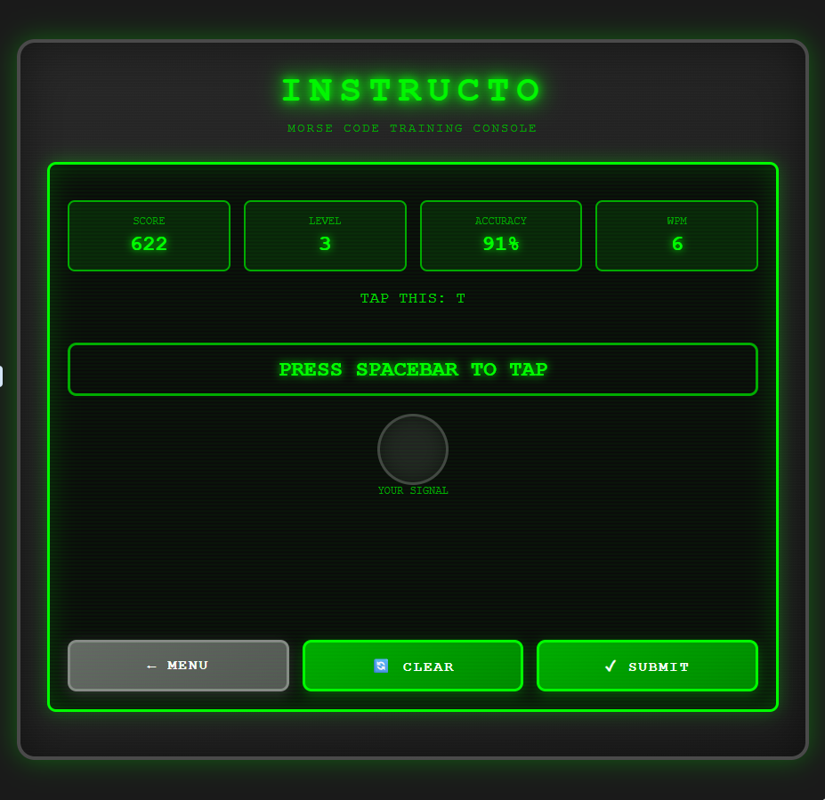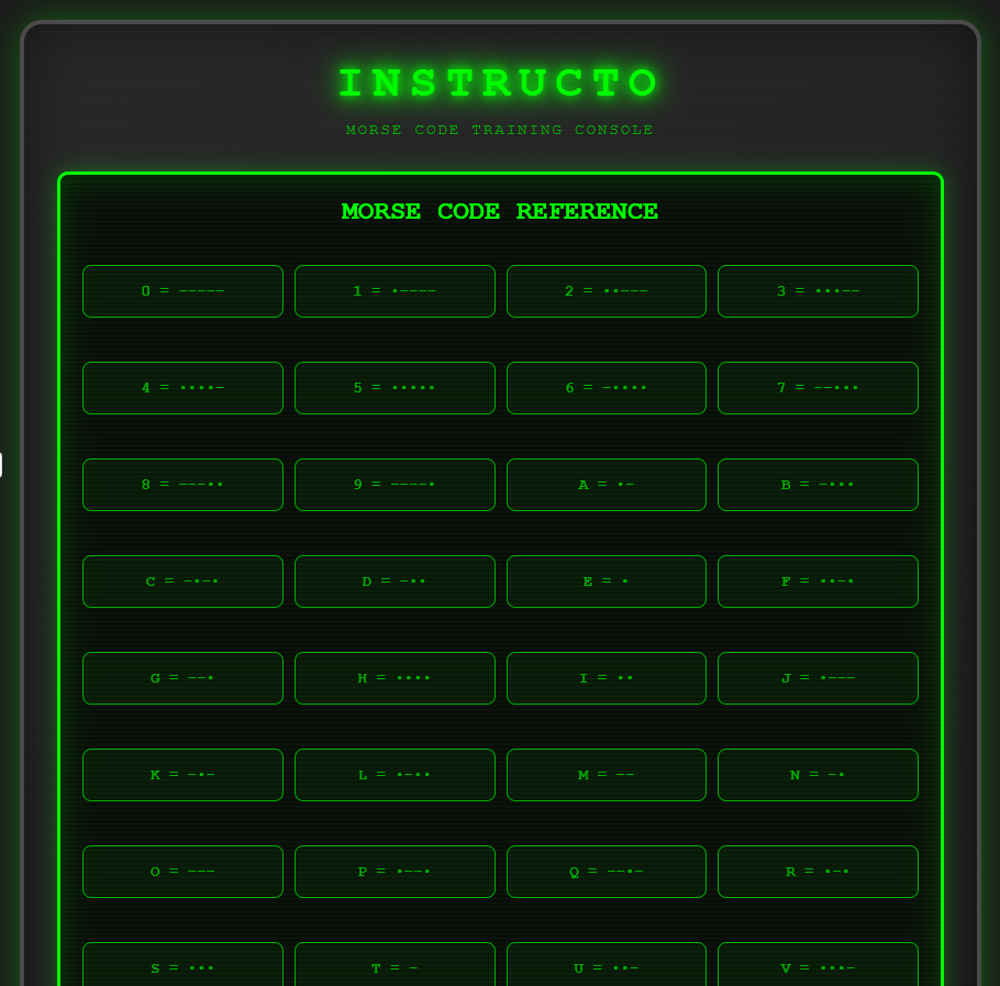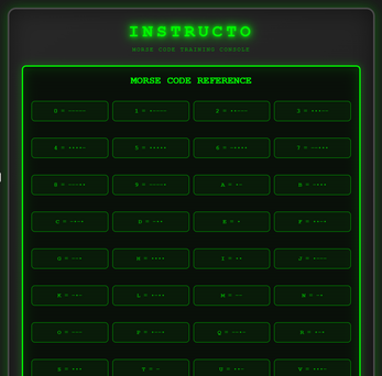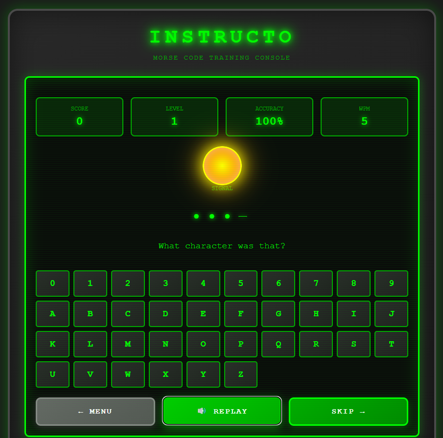 INSTRUCTO - Morse Code Training Console is a standalone, browser-based educational game styled as a retro-futuristic hacking terminal that teaches International Morse Code through immersive, interactive training. With a striking green-on-black CRT aesthetic, glowing lightbulbs, scanlines, and flickering effects, players learn to both decode (listen and identify) and encode (manually tap out) Morse code. The game features four main modes: a guided Tutorial, Decode Challenge, Encode Challenge, and a full Morse Reference chart. It includes progressive difficulty, real-time scoring, accuracy tracking, level progression, and authentic audio tone generation, making it both an effective learning tool and an engaging retro-styled experience. No external dependencies or installation required — it runs entirely in the browser.